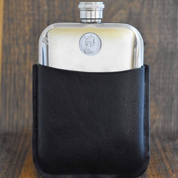 1976 Australian Five Cents Hip Flask, 50th Birthday Gift- Black Leather