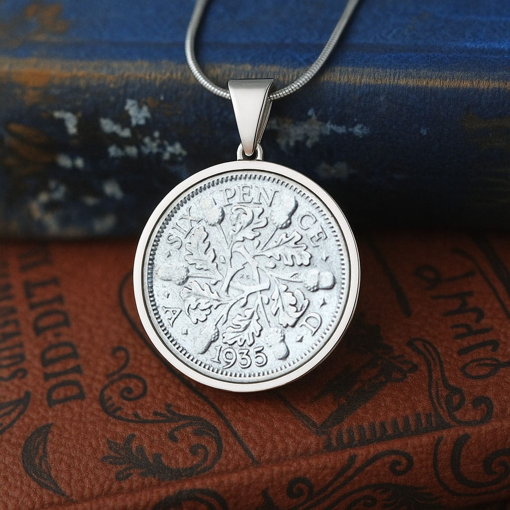 Outstanding quality coin necklaces made from genuine, highly polished Sixpences minted in 1935. Whether the recipient of your gift was born or married in 1935 and you are shopping for a 90th birthday or anniversary gift, or it was a very special year for another reason, these necklaces make a very thoughtful and personalised gift.