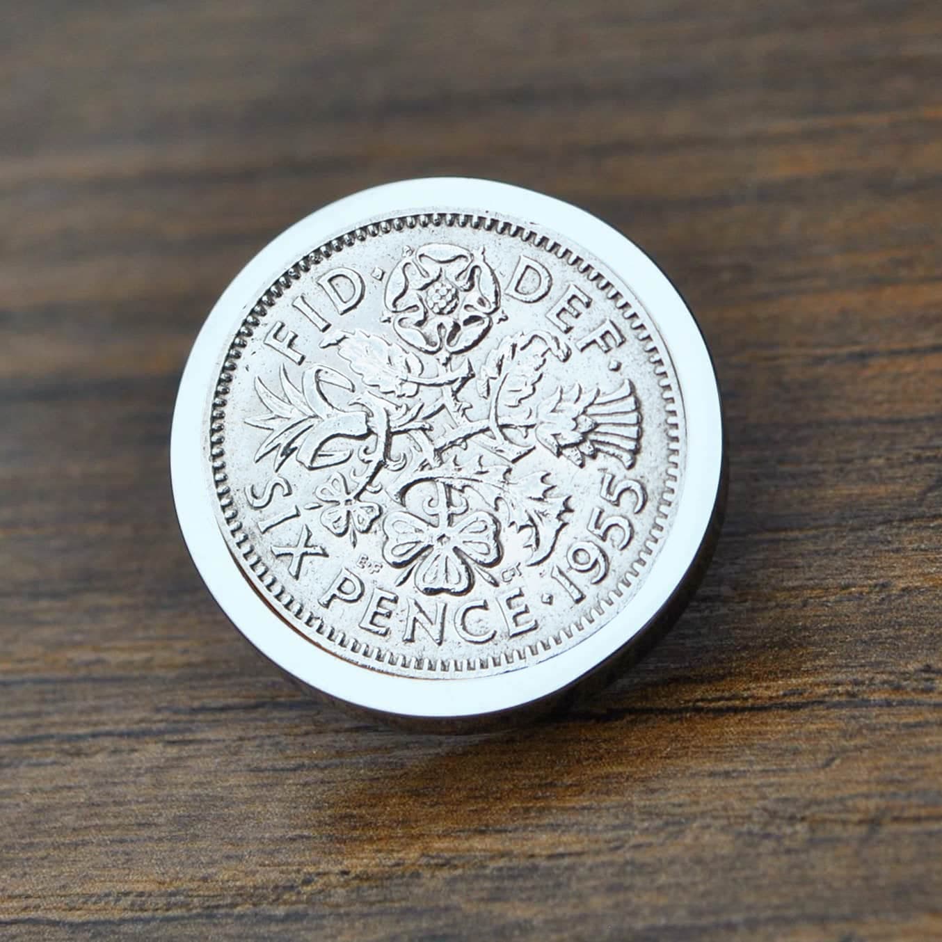 Outstanding quality coin Brooch/Tie Pins made from genuine, highly polished Sixpences minted in 1955. Whether the recipient of your gift was born or married in 1955 and you are shopping for a 70th birthday or anniversary gift, or it was a very special year for another reason, these Brooch/Tie Pins make a very thoughtful and personalised gift.