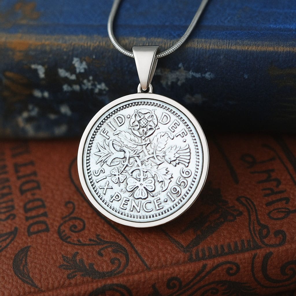 Outstanding quality coin necklaces made from genuine, highly polished Sixpences minted in 1956. Whether the recipient of your gift was born or married in 1956 and you are shopping for a 69th birthday or anniversary gift, or it was a very special year for another reason, these necklaces make a very thoughtful and personalised gift.