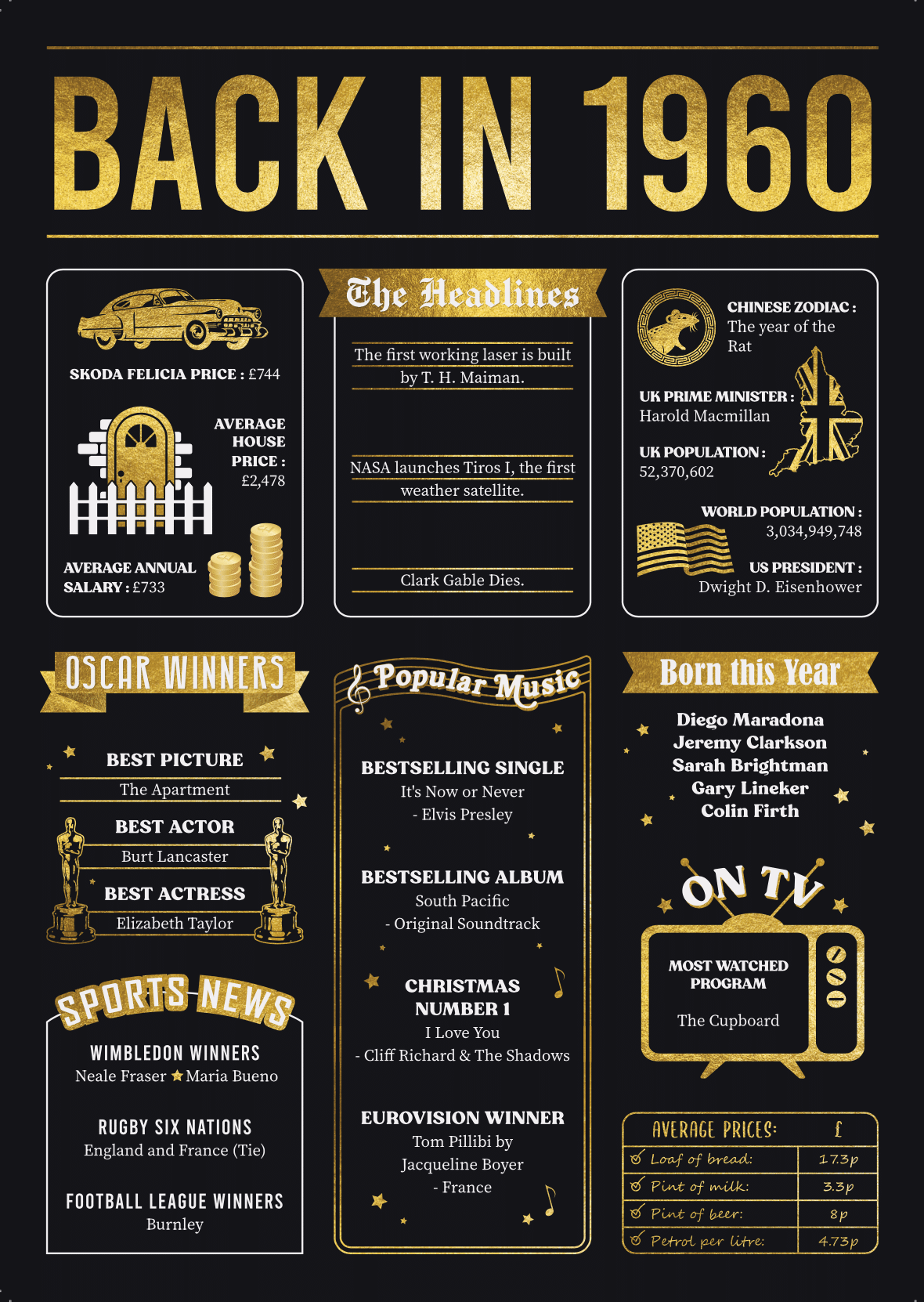 The 60+ facts and figures neatly displayed on the card have been researched in depth by the team at Heads and Tails Jewellery. The facts include lots of memories and conversation starters such as: