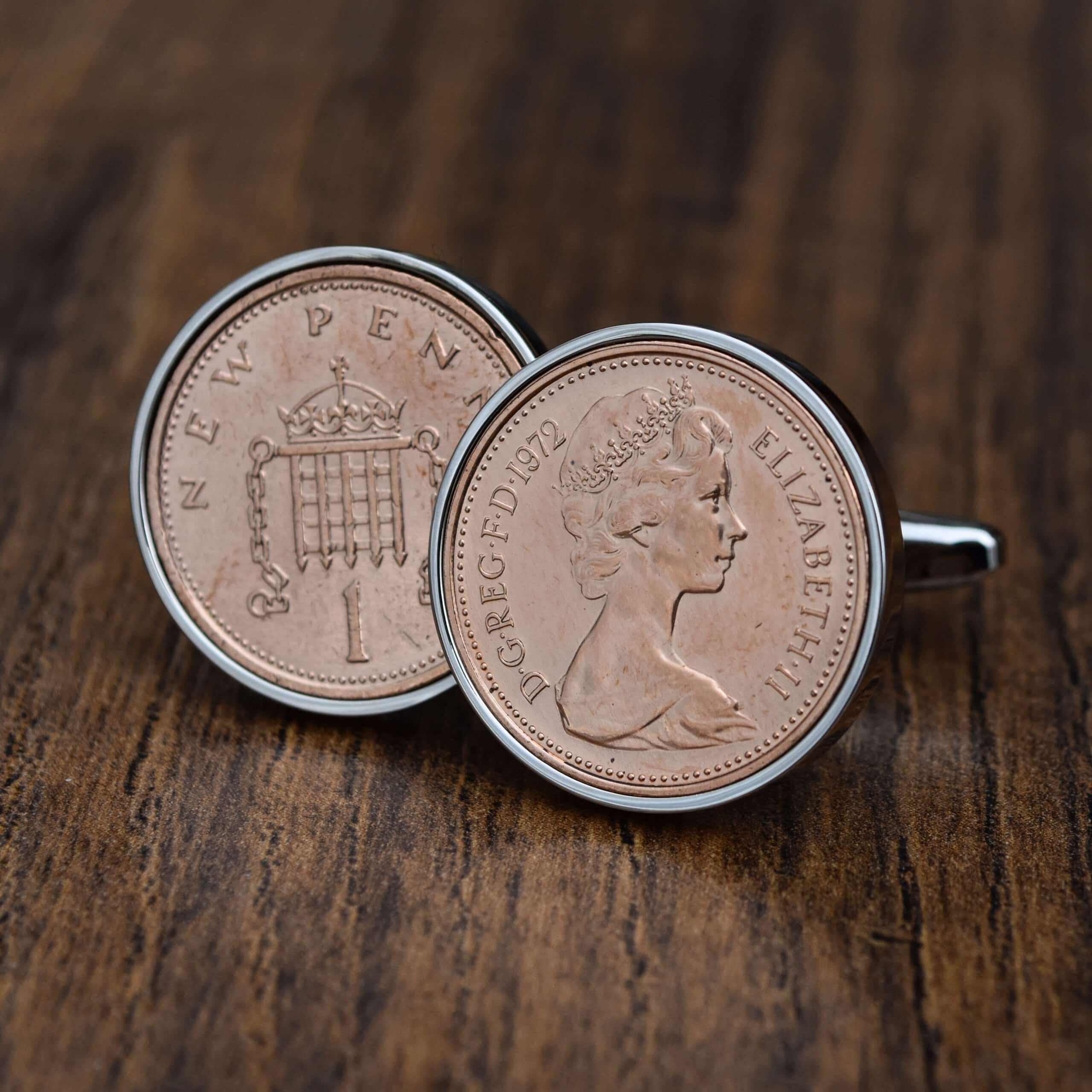 Outstanding quality coin cufflinks made from genuine, highly polished One Pences minted in 1972. Whether the recipient of your gift was born or married in 1972 and you are shopping for a 53rd birthday or anniversary gift, or it was a very special year for another reason, these cufflinks make a very thoughtful and personalised gift.