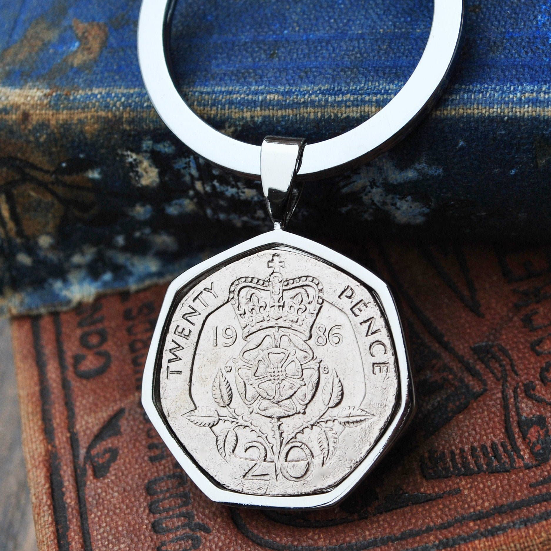 1986 Twenty Pence Coin Keyring, 40th Birthday or Anniversary Gift – Silver