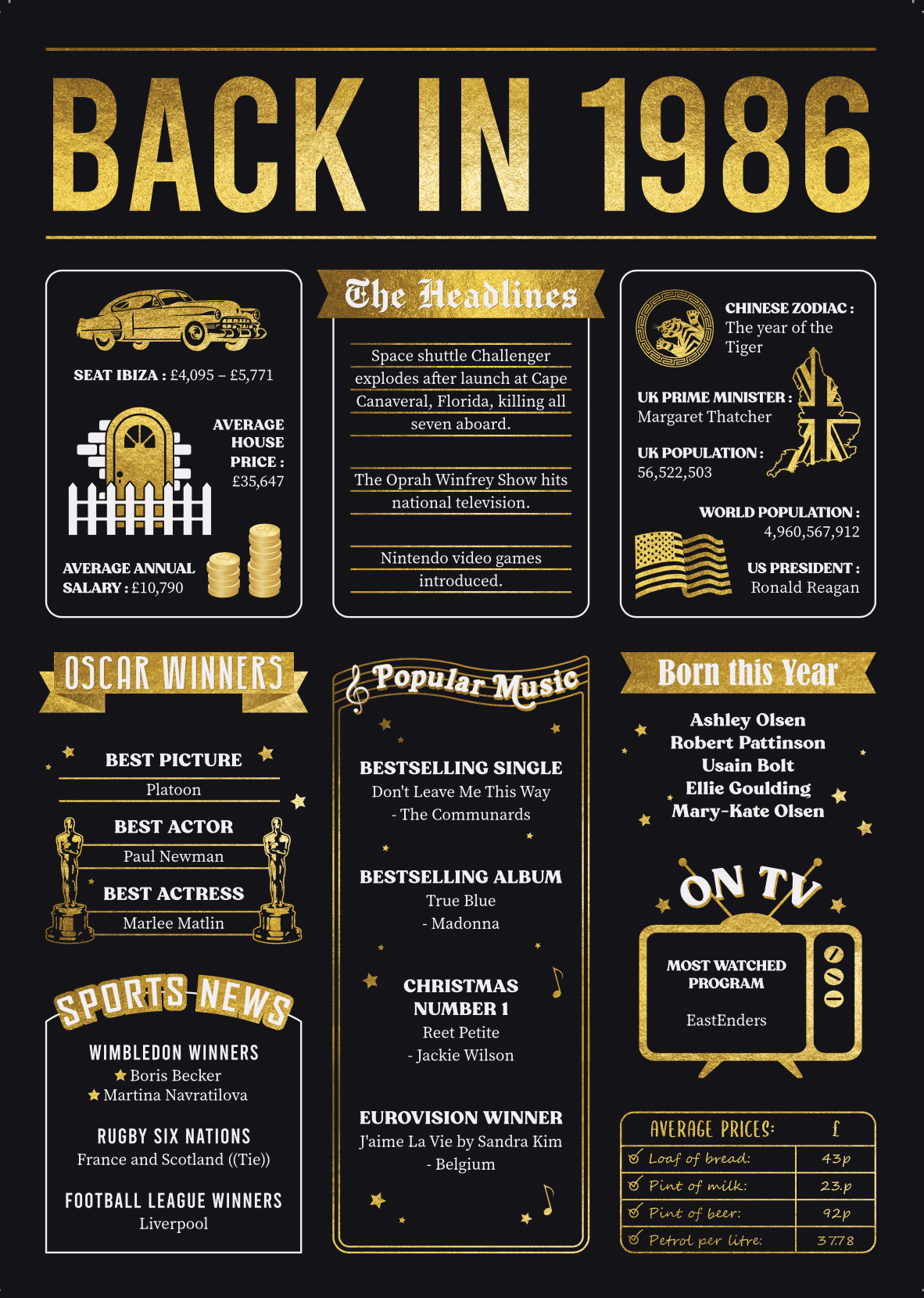 Sports Winners such as Premiership winners, Six Nations and Wimbledon winners in 1986.