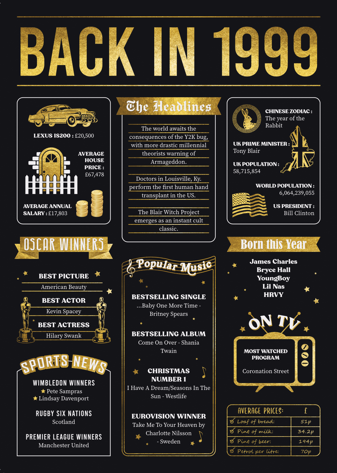 The 60+ facts and figures neatly displayed on the card have been researched in depth by the team at Heads and Tails Jewellery. The facts include lots of memories and conversation starters such as: